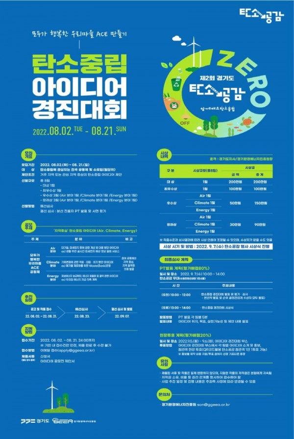 경기도와 경기환경에너지진흥원은 2050년 탄소중립 실현을 위한 생활 밀착형 정책을 발굴하고 도입하기 위해 ‘탄소중립 아이디어 경진대회’를 개최한다고 8일 밝혔다.