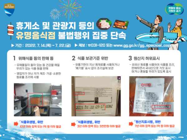 경기도 특별사법경찰단이 휴가철을 맞이해 7월 14일부터 22일까지 도내 휴게소 및 관광지 내 유명음식점을 집중 단속한다.