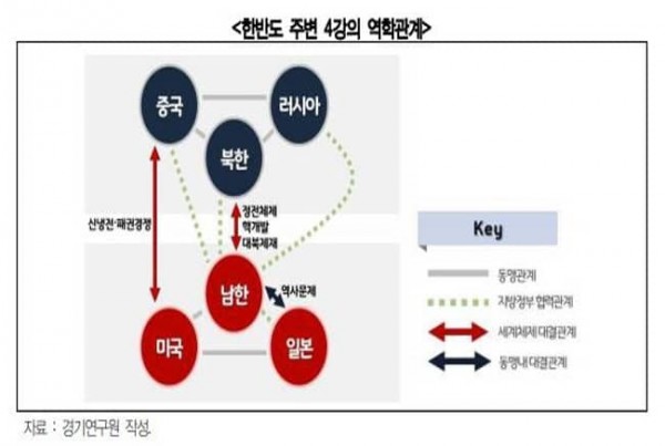 이성우 경기연구원 연구위원은 “한반도를 둘러싼 동아시아 국제관계의 핵심은 한반도의 비핵화를 통한 평화협력체제를 출발점으로 궁극적으로 경제적 번영을 공유하는 공동번영체제의 정착”이라며 “한국 외교는 2022년부터 진영외교로 안보 이익을 확보하는 기존 외교정책과 함께 다자외교로 상대적 이익의 프레임을 절대적 이익의 프레임으로 전환하고, 장기적으로 강화된 국력을 활용해 한반도 평화와 비핵화를 추진하는 독자외교의 출발점을 마련해야 한다”고 말했다.