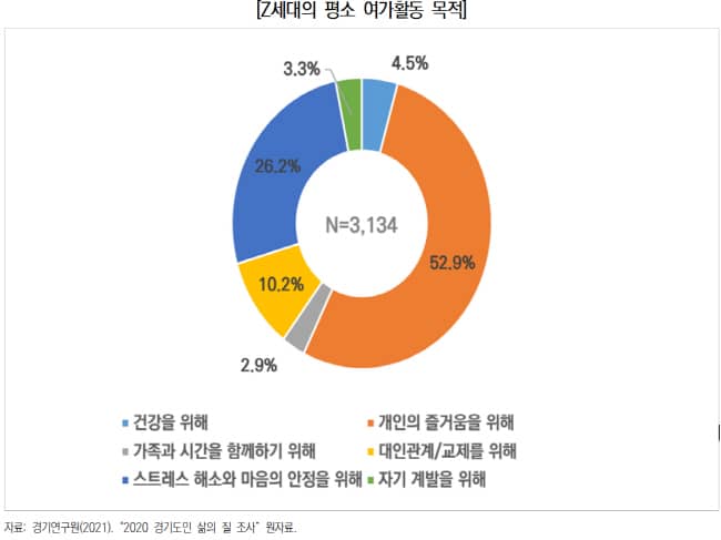 경기연구원은 지난해 9월부터 11월까지 경기도 1만6,000가구를 대상으로 한 ‘2020 경기도민 삶의 질 조사’ 내 여가활동 부문을 재분석한 ‘경기도민의 세대별 여가활동 특성 분석’ 보고서를 발간했다고 6일 밝혔다.
