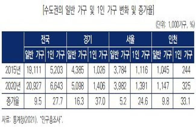 경기도 1인 가구는 1990년 13만 가구(전체 8.1%)에서 2020년 140만 가구(전체 27.6%)로 전체 가구에서 차지하는 비중이 3배 이상 증가했다. 1인 가구 비율은 전국(31.7%)과 수도권(서 울 34.9%, 인천 28.3%)에 비해 낮은 수준이지만 2015~2020년 기간 1인 가구 증가율은 37.0%로 전국(27.7%), 수도권(인천 33.1%, 서울 24.6%)에 비해 증가 속도가 가장 빠르다.