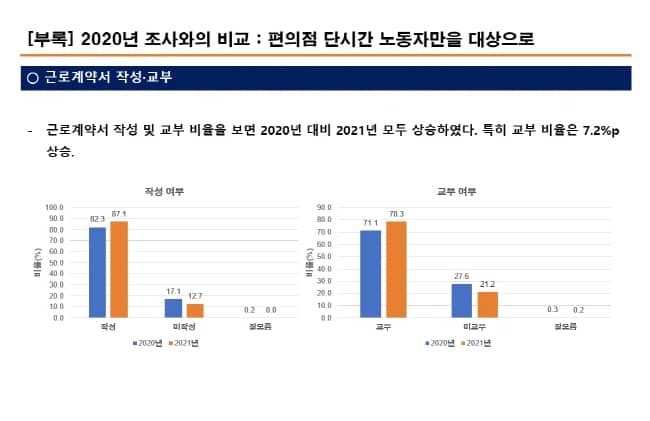 2020년 실태조사 결과와 비교 시, 근로계약서 교부 비율은 71.1%에서 78.3%로 7.2% 상승했고, 최저임금 미만자 비율은 10.1%에서 4.9%로 5.2%가량 감소하는 등 노동환경이 다소 개선된 것으로 나타났다. 서포터즈의 적극적 활동이 노동권 개선에 도움을 줬다는 것을 알 수 있는 대목이다.