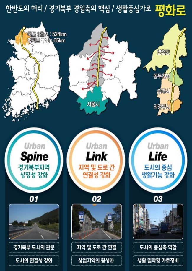 평화로는 경원권 4개 시‧군 의정부~양주~동두천~연천을 잇는 총연장 65㎞의 국도 3호선이다. 경원권 4개 시‧군은 택지 및 도시개발로 지난 20년간 인구가 58만8,000여 명(2000년)에서 82만여 명(2020년)으로 약 1.4배 증가했고, 교통량 또한 거주인구 증가와 함께 지속적으로 늘어났다.