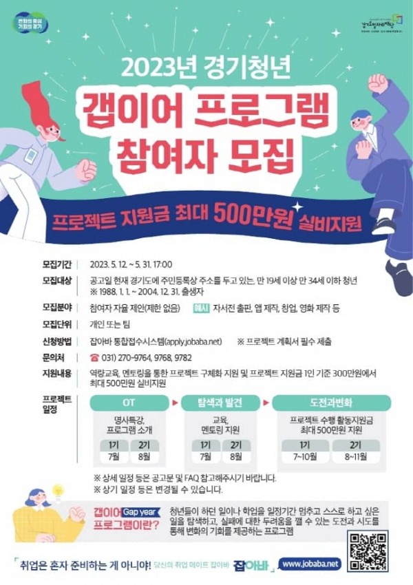 경기도일자리재단은 오는 5월 31일까지 ‘경기청년 갭이어 프로그램’ 참여자 600명을 모집한다.