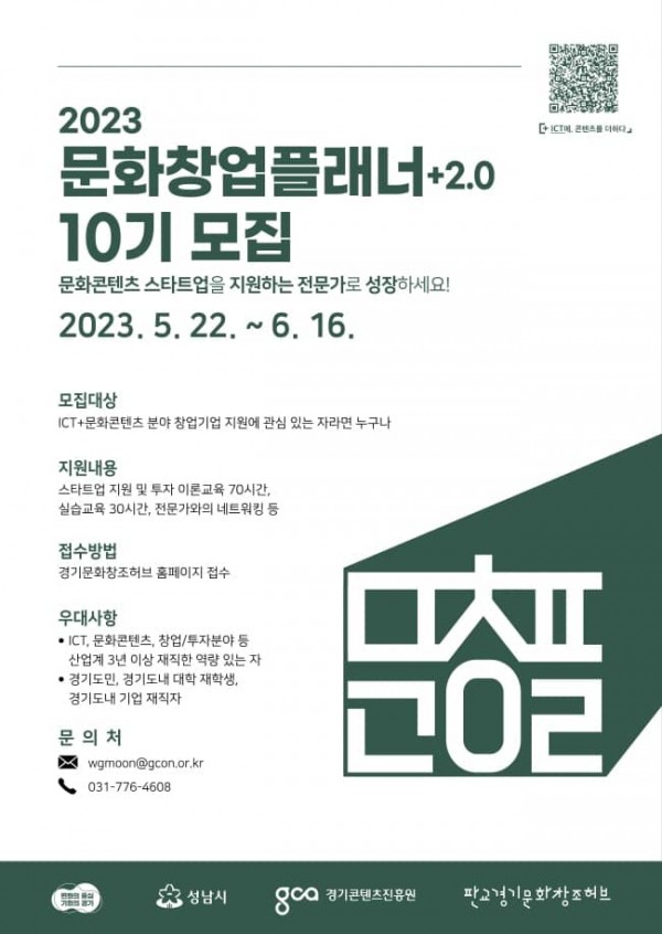 경기도가 5월 22일부터 6월 16일까지 문화콘텐츠와 정보통신기술(ICT)을 접목한 융복합 분야 창업지원 전문인력인 ‘문화창업플래너’ 10기 교육생 20명을 모집한다.