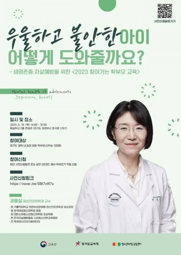18일에는 ‘우울하고 불안한 아이, 어떻게 도와줄까- ’라는 주제로 권용실 교수(가톨릭대학교 의정부 성모병원 정신건강의학과 임상과장)의 강의와 청소년기 자녀를 둔 학부모들의 질의응답이 이루어진다.