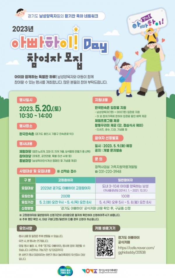 모집 대상은 3~10세 자녀(자녀 생년월일 2014년 1월 1일생~2021년 12월 31일생)를 둔 경기도 남성 양육자 100명이다. 모집 신청은 5월 4일 오후 5시부터 8일 오전 8시까지 ‘경기도 아빠하이’ 공식카페(cafe.naver.com/gghidaddy/20538)를 통해 접수된다.