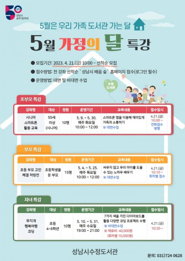 성남도시개발공사(이하 공사)가 운영하는 수정도서관이 5월 가정의 달을 맞아 오는 4일부터 31일까지 가정의 달 행사를 운영한다고 3일 밝혔다.