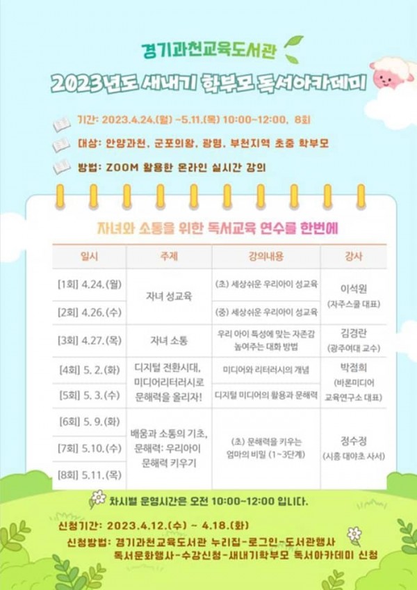 4월 24일부터 5월 11일까지 진행되는 이번 아카데미는 학부모들에게 자녀와의 소통과 독서역량 강화 등 자녀교육에 도움을 주고자 기획됐다.