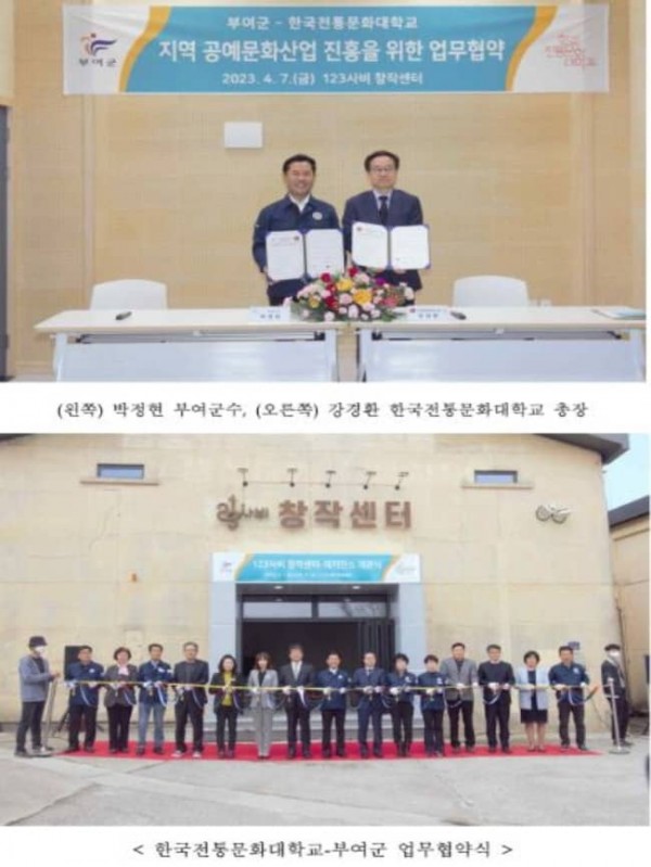 부여군은 청년을 중심으로 지역공예문화산업을 활성화하기 위해 ‘123사비 공예마을’을 설립하고 공예마을 안에 ‘창작센터’, ‘레지던스’, ‘아트큐브’ 등 공예창작 기반 시설들을 운영하고 있다. 한국전통문화대학교는 공예마을 내의 실습 공간 및 장비를 교육에 활용하고 지역 공예문화시설을 활용한 기획전시나, 문화예술 관련 명사 초청 특강 프로그램 운영 등을 공동으로 추진할 예정이다.