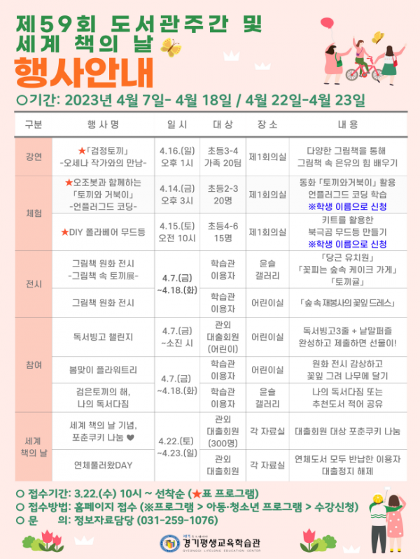 주요 행사로는 ▲2022년 볼로냐 올해의 일러스트레이터로 선정된 <검정토끼>의 저자 오세나 작가와의 만남 ▲동화책을 활용한 코딩 체험 ▲직접 만드는 폴라베어 무드등 만들기 ▲독서빙고 챌린지 ▲봄맞이 플라워트리 ▲검은토끼의 해, 나의 독서 다짐 ▲그림책 원화전시 등이 진행된다.