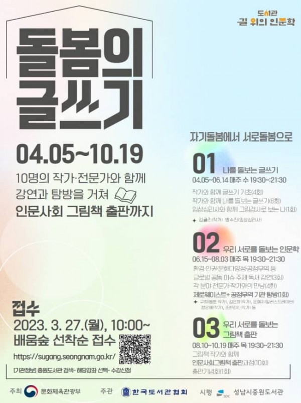 성남도시개발공사(사장 정건기, 이하 공사)가 운영하는 중원도서관은 문화체육관광부가 주최하는 ‘2023년 도서관 길 위의 인문학’ 공모사업에 선정됐다고 23일 밝혔다.
