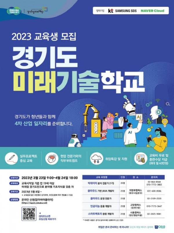 참가 대상은 미래기술 분야 교육 및 취업을 희망하는 만 19세 이상 미취업 경기도민이다. 신청 방법은 오는 4월 24일까지 경기도일자리재단 통합접수시스템 ‘잡아바 어플라이(https://apply.jobaba.net)’를 통해 온라인 접수하면 된다.