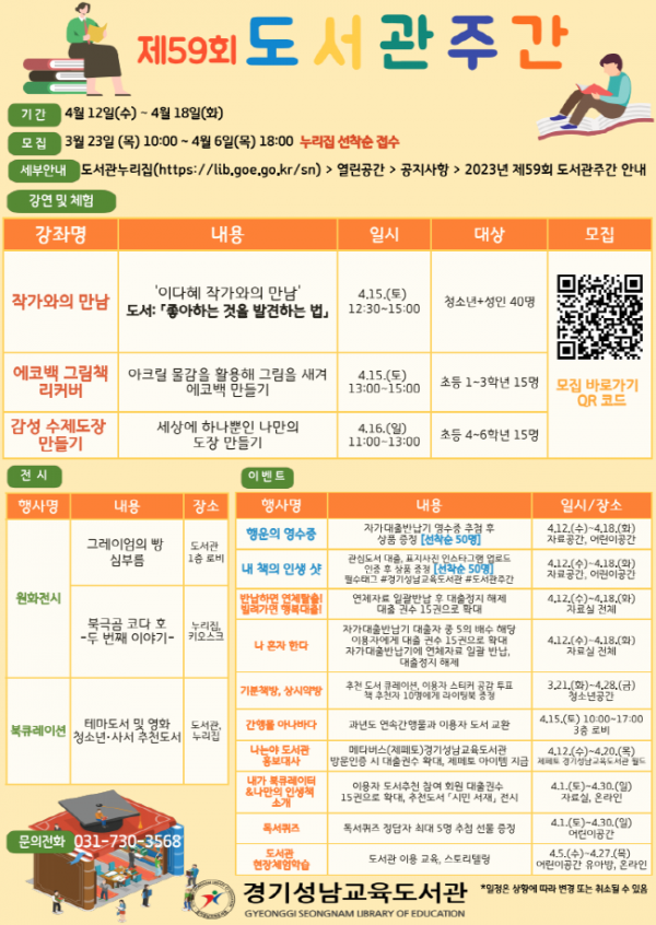 경기성남교육도서관(관장 여재구)이 4월 12일부터 18일까지 학생, 성인, 지역주민을 대상으로 도서관 주간 독서문화 프로그램을 진행한다.
