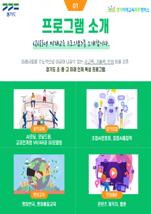 경기도평생교육진흥원 경기미래교육 파주캠퍼스가 2월 27일부터 3월 6일까지 경기도 청소년을 대상으로 인공지능(AI) 코딩과 웹툰 등을 교육하는 ‘미래교육’ 참가자를 모집한다.