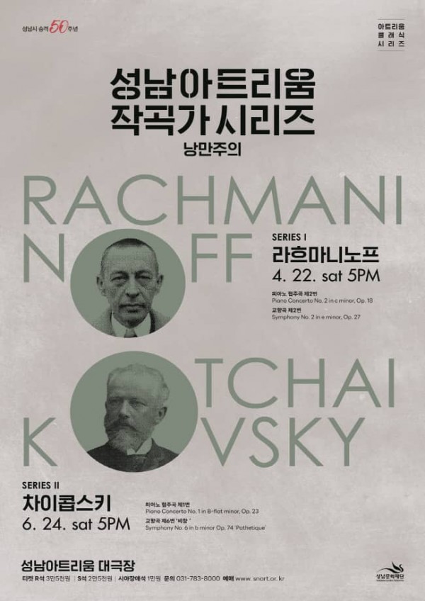 성남아트리움이 2023년 새롭게 선보이는 ‘작곡가 시리즈’는 한 시대를 대표하는 작곡가의 대표작을 소개하고 작품세계를 깊이 있게 탐구하는 기획공연이다. 올해 첫 시즌에는 ‘낭만주의’를 주제로, 러시아 낭만주의 음악을 대표하는 라흐마니노프와 차이콥스키의 음악과 함께 4월과 6월 관객들을 만날 예정이다.