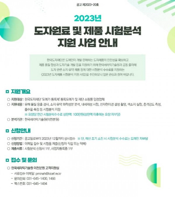 신청접수 관련 자세한 내용은 한국도자재단 누리집(www.kocef.org)에서 확인할 수 있으며 기타 문의 사항은 한국세라믹기술원 이천 분원 고객지원실(031-645-1400)로 전화하면 안내받을 수 있다.