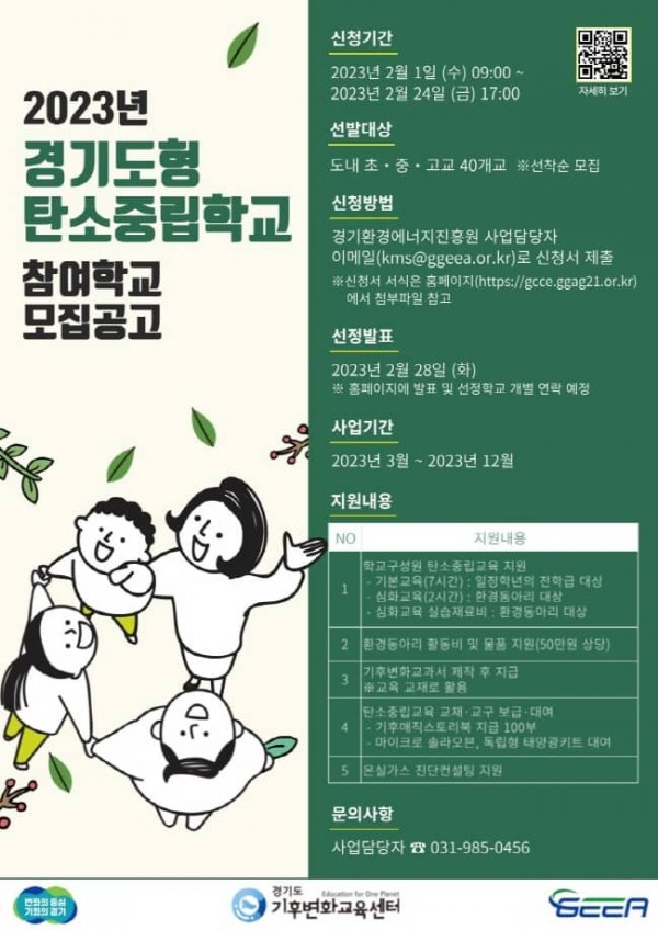 선정 발표는 2월 말 경기도기후변화교육센터 누리집(gcce.ggag21.or.kr)에서 확인할 수 있다. 보다 자세한 내용은 경기도 누리집(gg.go.kr), 경기도기후변화센터 누리집 참여학교 모집 공고문에서 확인할 수 있다.
