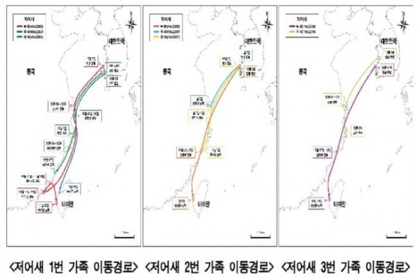 이에 국립문화재연구원은 지난해 6월 저어새 세 가족에 위치추적기를 부착하고 방사한 후 지난해 10월 초부터 11월 초 사이에 겨울나기를 위해 이동하는 각 개체들의 경로를 분석한 결과, 서남해안 연안 갯벌에서 먹이를 먹고, 겨울을 나기 위해 부모와 자식개체가 서로 다른 경로로 중국과 대만으로 이동하는 것으로 확인되었다.