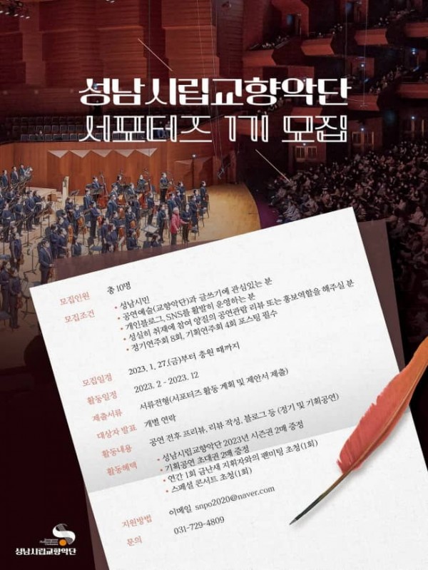 서포터즈 모집에 응하려는 성남시민은 기한 내 성남시립예술단 홈페이지에 있는 활동 계획서와 제안서를 작성해 성남시향 공용 이메일(snpo2020@naver.com)로 보내면 된다.