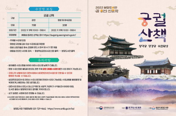 성남시 관계자는 “이번 강좌를 통해 우리 궁궐의 문화, 역사, 건축물을 탐구하여 그 가치와 미(美)를 감상하고 현장 탐방을 거쳐 깊이 있는 인문학적 문화를 향유하는 좋은 기회가 되기를 바란다.”라고 말했다.