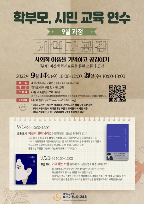 4.16민주시민교육원(원장 전명선)은 4.16 세월호 참사의 의미를 되새기고 민주시민 역량을 강화하기 위해 다음 달 14일과 21일 ‘사회적 아픔을 기억하고 공감하기’라는 주제로 독서 토론을 운영한다.
