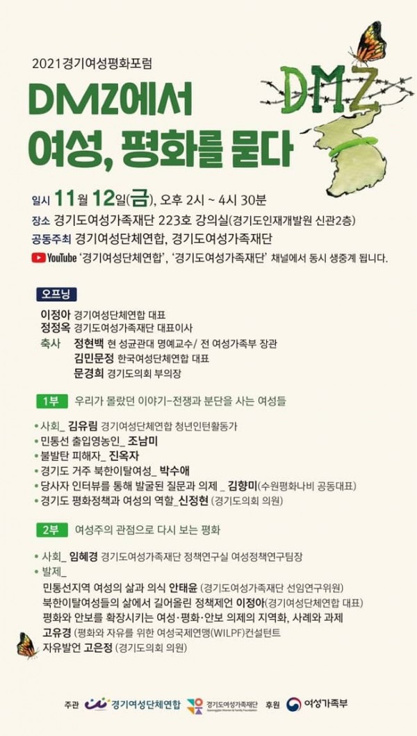‘우리가 몰랐던 이야기-전쟁과 분단을 사는 여성들’이라는 주제로 진행되는 1부에서는 민간인통제선 출입영농인과 접경지역의 불발탄 피해여성, 북한이탈여성 등 당사자 여성들이 한국전쟁과 분단, 군사주의의 영향 하에서 살아온 여성들의 경험을 공유한다. 이어 김향미 수원평화나비 공동대표와 신정현 경기도의회 의원의 발표 및 토론을 통해 여성의 경험과 관점이 포함된 경기도 평화정책 방향을 모색한다.