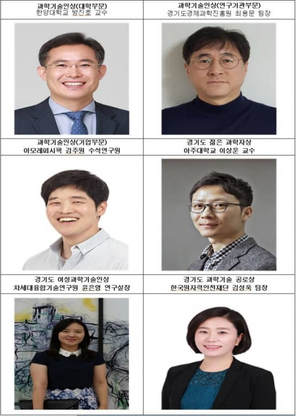 수상자는 ▲경기도 과학기술인상(대학부문): 한양대학교 방진호 교수 ▲경기도 과학기술인상(연구기관부문): 경기도경제과학진흥원 최용문 팀장 ▲경기도 과학기술인상(기업부문): 아모레퍼시픽 김주원 수석연구원 ▲경기도 젊은 과학자상: 아주대학교 이상운 교수 ▲경기도 여성과학기술인상: 차세대융합기술연구원 윤은영 연구실장 ▲경기도 과학기술 공로상: 한국원자력 안전재단 김성욱 팀장이다.