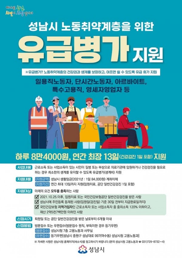 성남시(시장 은수미)는 노동 취약계층의 건강권과 생계보장을 위해 유급병가 지원사업을 편다고 10월 28일 밝혔다.