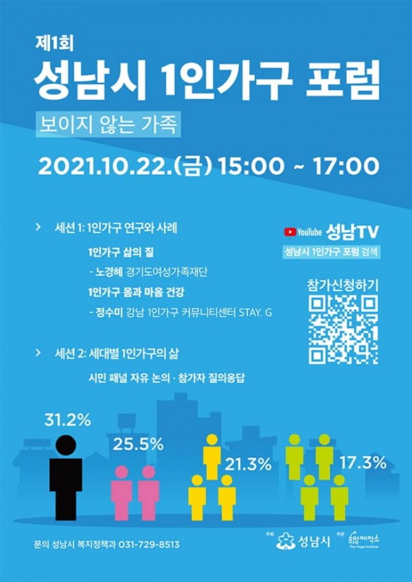 성남시(시장 은수미)는 오는 10월 22일 오후 3시~5시 ‘제1회 1인 가구 포럼’을 온라인으로 개최한다.