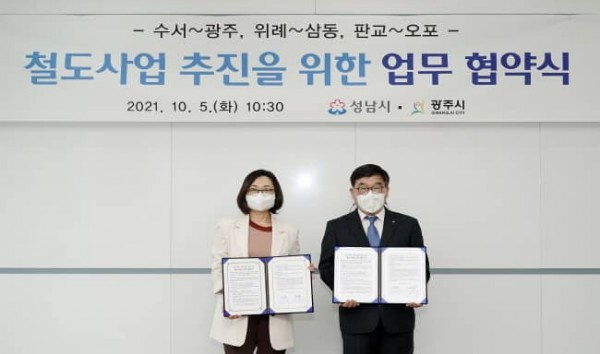 성남시는 5일 성남시청 2층 회의실에서 은수미 성남시장, 신동헌 광주시장 등이 참석한 가운데 성남광주간 철도사업인 “수서~광주간 복선전철”, “위례~삼동간 경전철”, “판교~오포간 철도사업”과 관련하여 상호 협력을 위한 업무협약을 체결하였다.