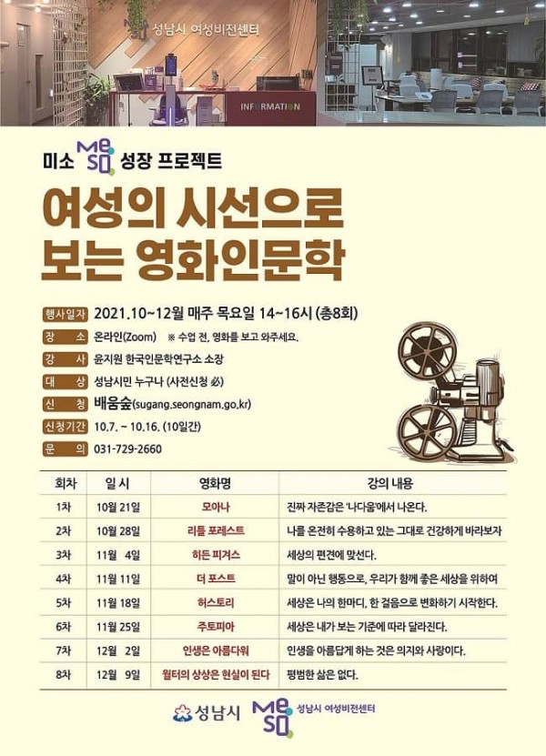 성남시(시장 은수미)는 오는 10월 21일부터 12월 9일까지 총 8회차 과정의 ‘여성의 시선으로 보는 영화 인문학’ 온라인 강좌를 운영한다.