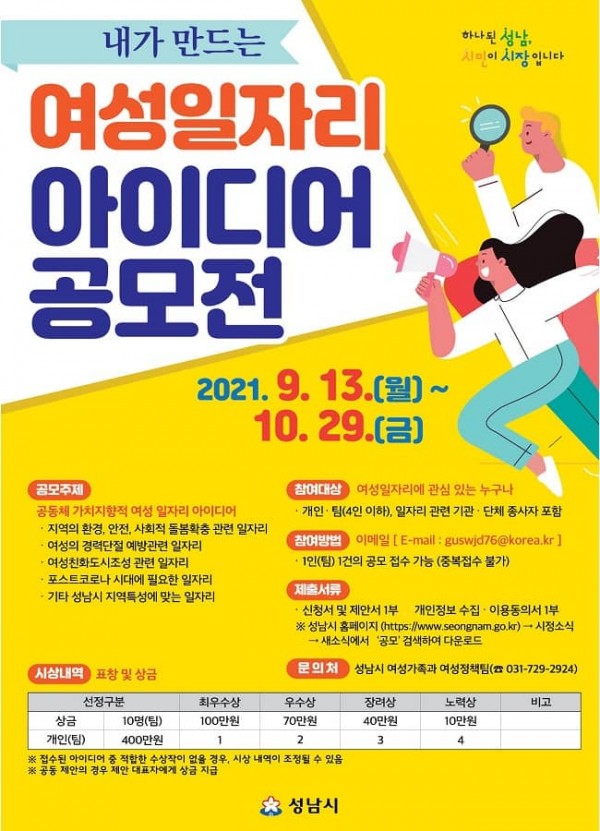 기간 내 성남시 홈페이지(새소식)에 있는 참가신청서, 아이디어 제안서, 개인정보 수집·이용동의서를 작성해 시청 여성가족과 담당자 이메일(guswjd76@korea.kr)로 보내면 된다.