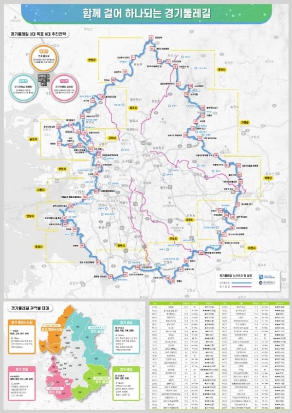 경기 둘레길은 경기도 외곽에 있는 15개 시·군의 기존 걷기여행길을 연결해 약 860km 60개 코스로 조성하는 사업이다. 2018년 11월 기본계획 수립으로 추진돼 올 연말 전 구간 개통을 앞두고 있다. 도는 도민들의 안전하고 친환경적인 걷기 여행을 위해 임도, 제방길 등 위험한 길을 피해 연결하고 자연환경 훼손을 줄이기 위해 안내표지판을 최소화했다.