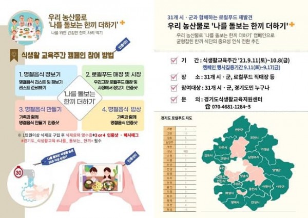 경기도는 31개 시군과 함께 오는 11일부터 10월 18일까지 시군 로컬푸드 직매장, 농협 등에서 ‘나를 돌보는 한 끼 더하기’ 식생활교육 캠페인을 추진한다.