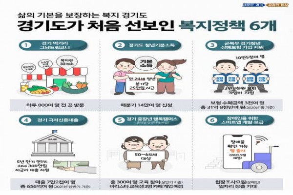 경기도가 ‘삶의 기본을 보장하는 복지 경기도’를 위해 각종 정책을 시행하고 있으며, 이 중 6개가 전국 최초로 추진한 정책이라고 1일 밝혔다.