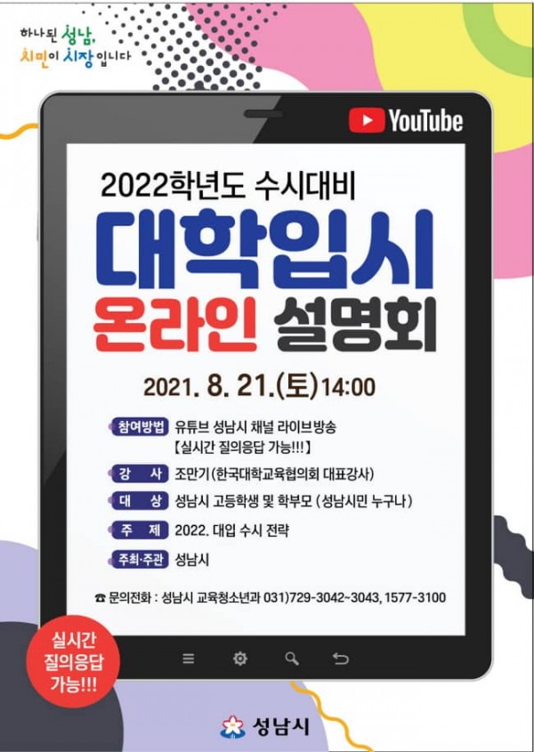 시 공식 유튜브 채널 ‘성남TV’를 통해 생중계하는 이번 설명회는 대학 입시 수시모집 원서 접수를 앞둔 고3 수험생과 학부모들을 위해 마련된다.