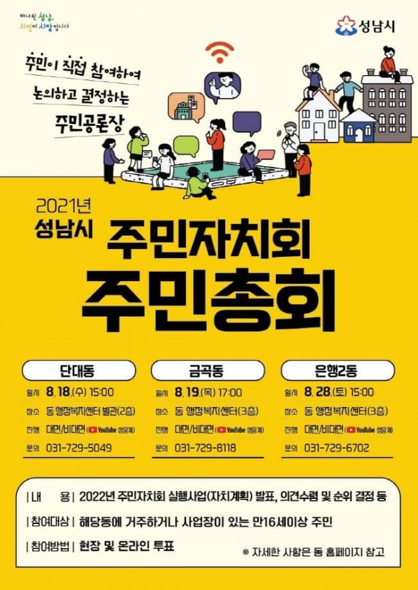 성남시(시장 은수미)는 오는 18일 수정구 단대동을 시작으로 19일 금곡동, 28일 은행2동 주민총회를 개최한다고 밝혔다.
