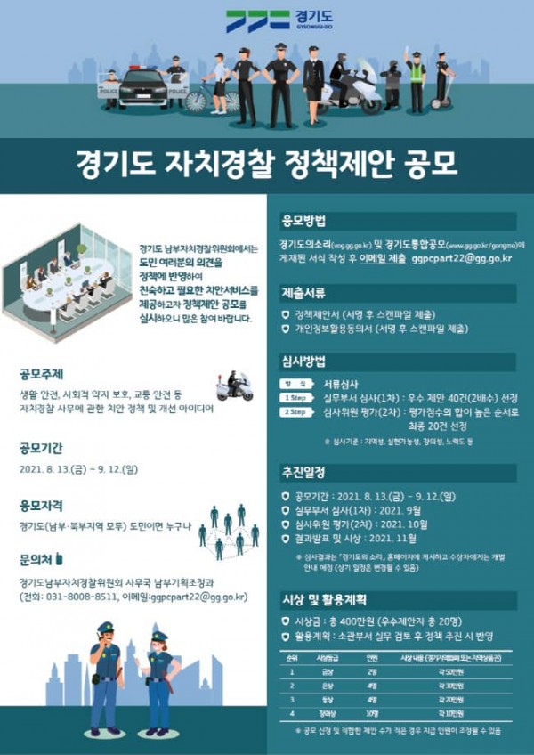 경기도남부자치경찰위원회는 도민의 의견을 반영한 치안 정책 수립을 위해 다음 달 12일까지 ‘경기도 자치경찰 정책 제안’을 공모한다.