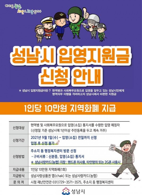 성남시 현역병·사회복무요원 입영지원금 10만원 지급