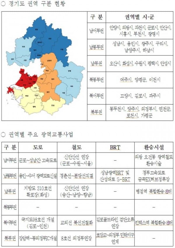 남서부권에서는 군포-성남간 고속도로 등 3개 사업, 남동부는 성남광역BRT 및 산성대로 S-BRT 등 4개 사업, 남부는 신안산선 연장 등 3개 사업, 북서부는 김포골드라인 검단오류 연장 등 4개 사업, 북부는 장암역-동의정부IC개설 등 3개 사업이 권역별 주요 광역교통사업으로 도출됐다.
