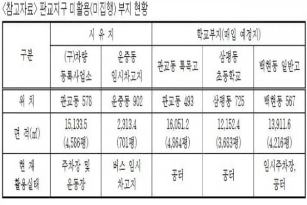 시 관계자는 “이번 용역을 통해 판교지구 내 미활용부지의 다양한 활용방안을 마련하고 최적의 방안을 선정해 주민들의 욕구를 해소할 수 있을 것”이라고 전했다.