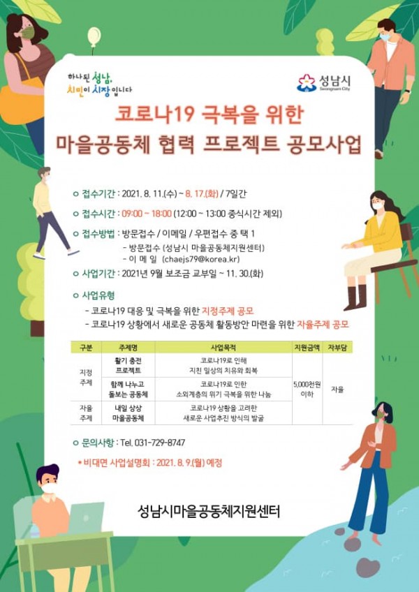 성남시(시장 은수미)는 코로나19 극복을 위한 마을공동체 협력 프로젝트 공모사업을 진행한다.