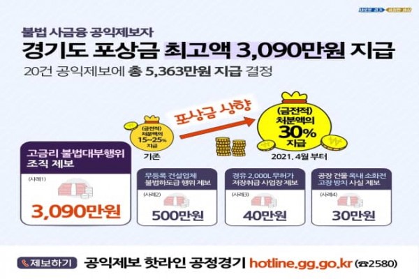 경기도가 불법 사금융 조직을 제보한 공익제보자에게 신고 포상금 3,090만 원을 지급한다. 도가 2019년 공익·부패신고 전담 창구인 ‘경기도 공익제보 핫라인’을 설치·운영한 뒤 지급한 포상금 가운데 최고액이다.