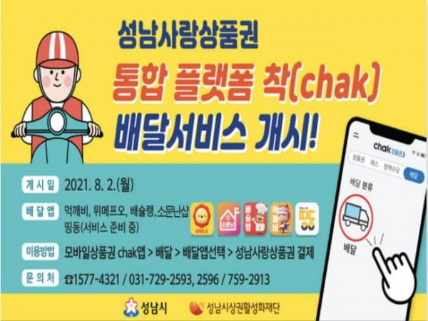 시는 8월 2일 먹깨비, 배슐랭, 소문난샵, 위메프오 등 4개 민간 배달앱을 성남사랑상품권 통합플랫폼인 모바일 앱 ‘착(chack)’에 연동했다. 오는 10월 말엔 ‘띵동’ 배달앱이 추가 연동된다.