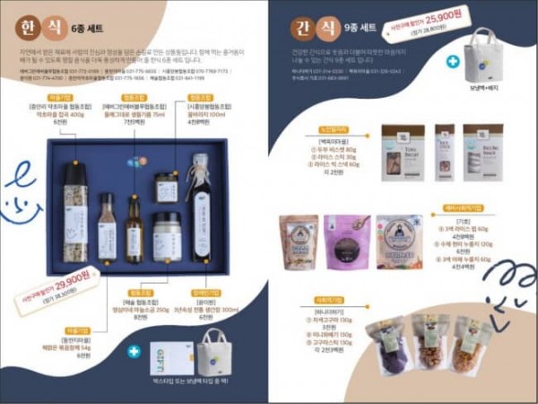 먼저 한식세트는 혼합잡곡, 꿀, 들기름, 마늘소금 등 6종으로 구성되며 기존 개별구매 소비자가격보다 20% 정도 저렴한 29,900원에 판매한다. 간식세트는 두부 비스킷, 라이스 스낵, 미니 꽈배기 등 전통간식 9종으로 이뤄졌고 판매가격은 25,900원이다. 구매 시에는 보냉백 또는 박스 포장 중 하나를 선택할 수 있다.