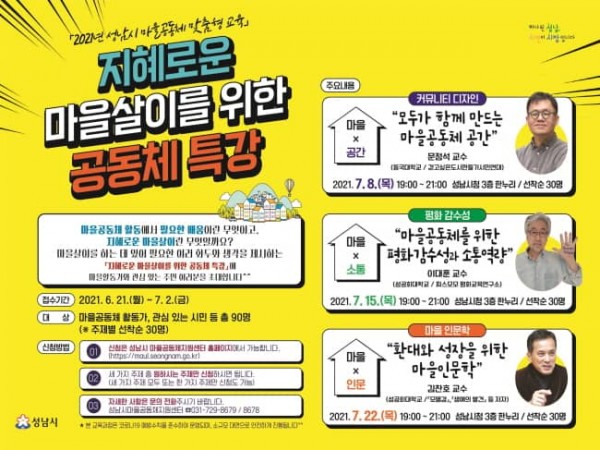 성남시(시장 은수미)는 오는 7월 8일과 15일, 22일 오후 7시 시청 3층 한누리에서 ‘지혜로운 마을살이를 위한 공동체 특강’을 연다.