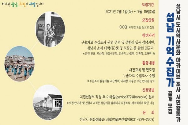 참여 자격은 구술자료 수집 관련 경험·경력이 있는 성남시민, 지역 소재 대학(원)이나 직장을 다니는 역사학, 문화인류학 등 관련 전공자다.