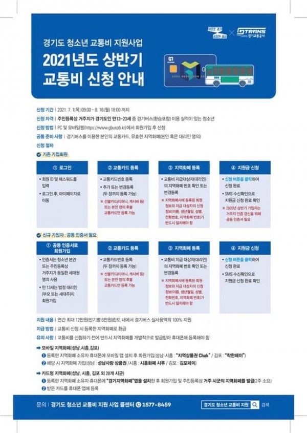 지원금 신청은 오는 7월 1일부터 8월 16일까지 ‘경기도 청소년 교통비 지원 포털 홈페이지(www.gbuspb.kr)’에 회원 등록이 되면 가능하다.