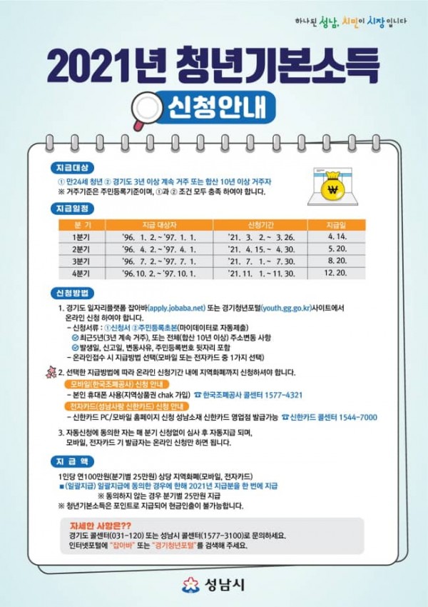 신청은 경기도 일자리플랫폼 잡아바 홈페이지(청년기본소득→지급방법 모바일 또는 카드 선택) 또는 경기청년포털을 통해 이뤄진다.
